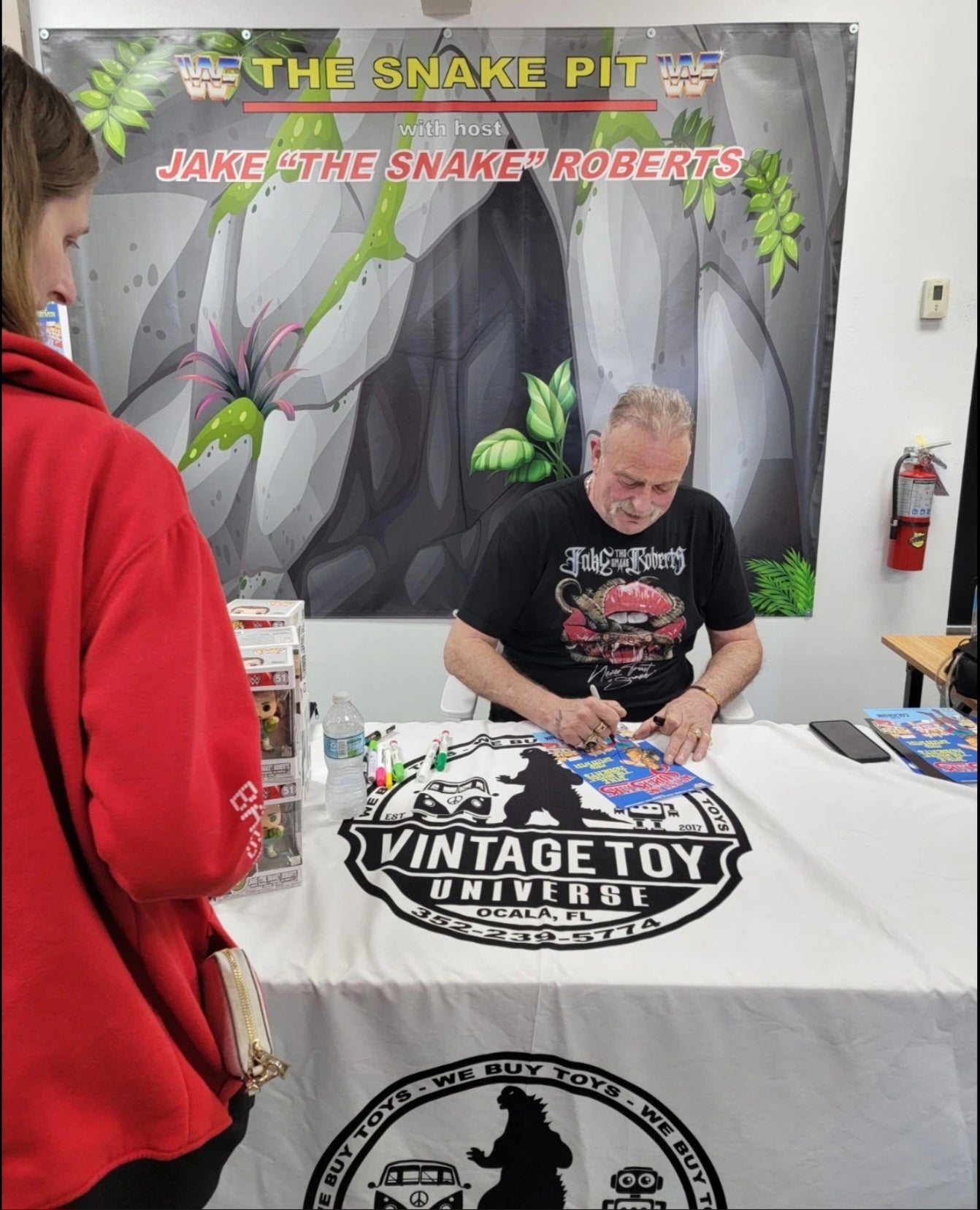 Jake The Snake Roberts Autographed Mini Poster Blue Ink No COA. This autograph session was on 1/8/2022 at a vintage toy store in Ocala, Florida. Please see attached photos.