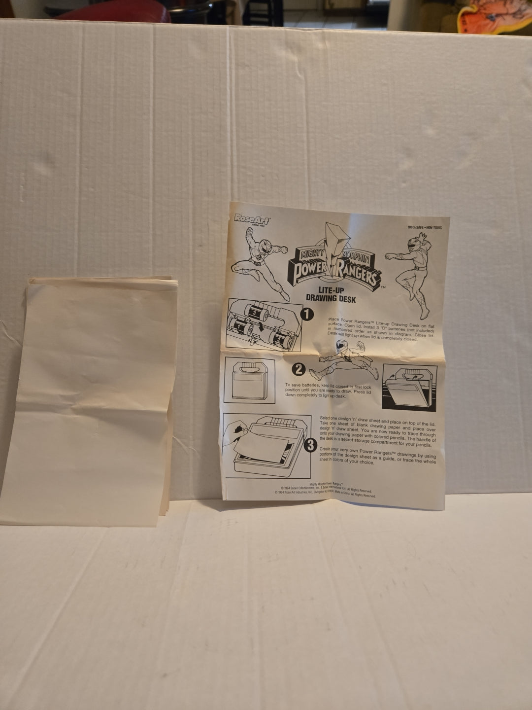Mighty Morphin Power Rangers 1994 Light-Up Desk. In good condition. The box has some shelf wear. The desk does light up (takes 3 D batteries not included). Some of the sheets have been colored. Please see attached photos.